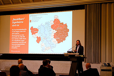 Auf die Ausführungen von Prof. Dr. Wesselmann bezugnehmend, erläuterte Matthias Wirtz, Leiter Research KSK Immobilien GmbH, in seinem Vortrag „Neue und alte Herausforderungen für die regionalen Immobilienmärkte“ die Preisentwicklungen bei Immobilien und Baukosten und verdeutlichte den Mangel an Wohnraumangeboten besonders entlang der Rheinschiene. Diese Negativtrends seien zwar nicht erst mit der Coronakrise und dem russischen Angriffskrieg auf die Ukraine entstanden, hätten aber durch diese Ereignisse nochmals zusätzlich an Dynamik gewonnen. Es sei ein intensiver Dialog innerhalb der Region nötig, um dem Mangel an bezahlbarem Wohnraum entgegenzuwirken.