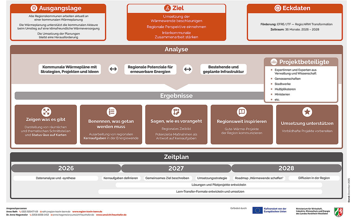 Um die Wärmewende in der Region auf Basis der kommunalen Wärmepläne der Kommunen (kWP) zu beschleunigen, hat der Region Köln/Bonn e.V. in Kooperation mit Fraunhofer UMSICHT das Projekt „Von den kommunalen Wärmeplänen zur Wärmewende in der Region Köln/Bonn“ entwickelt. Das Projekt wird im Rahmen des EFRE-Aufrufs Regio.NRW-Transformation durch die EU und das Ministerium für Wirtschaft, Industrie, Klimaschutz und Energie des Landes Nordrhein-Westfalen für drei Jahre gefördert und ist zum 1. Januar 2026 gestartet.