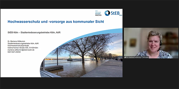 Dr. Marlene Willkomm von den Stadtentwässerungsbetrieben Köln zeigte in ihrem Vortrag Maßnahmen, Konzepte und Datengrundlagen des Hochwasserschutzes in Köln auf, die als Folge der Rheinhochwasser in den 1990er-Jahren entwickelt und umgesetzt wurden.